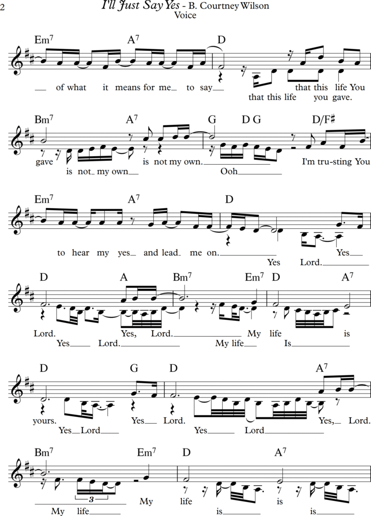 Yes Lord, yes Lord, my life is Yours. I’ll just say yes (yes Lord). You lead the way (yes Lord) I’m not afraid of what it means for me to say that this life You gave is not my own. I’m trusting You to hear my yes and lead me on.
